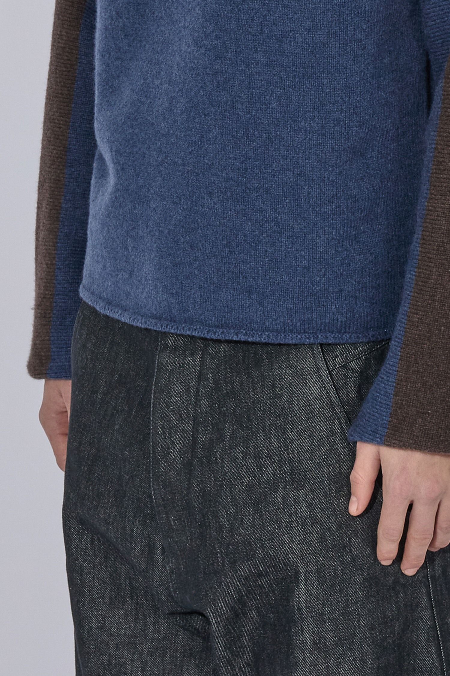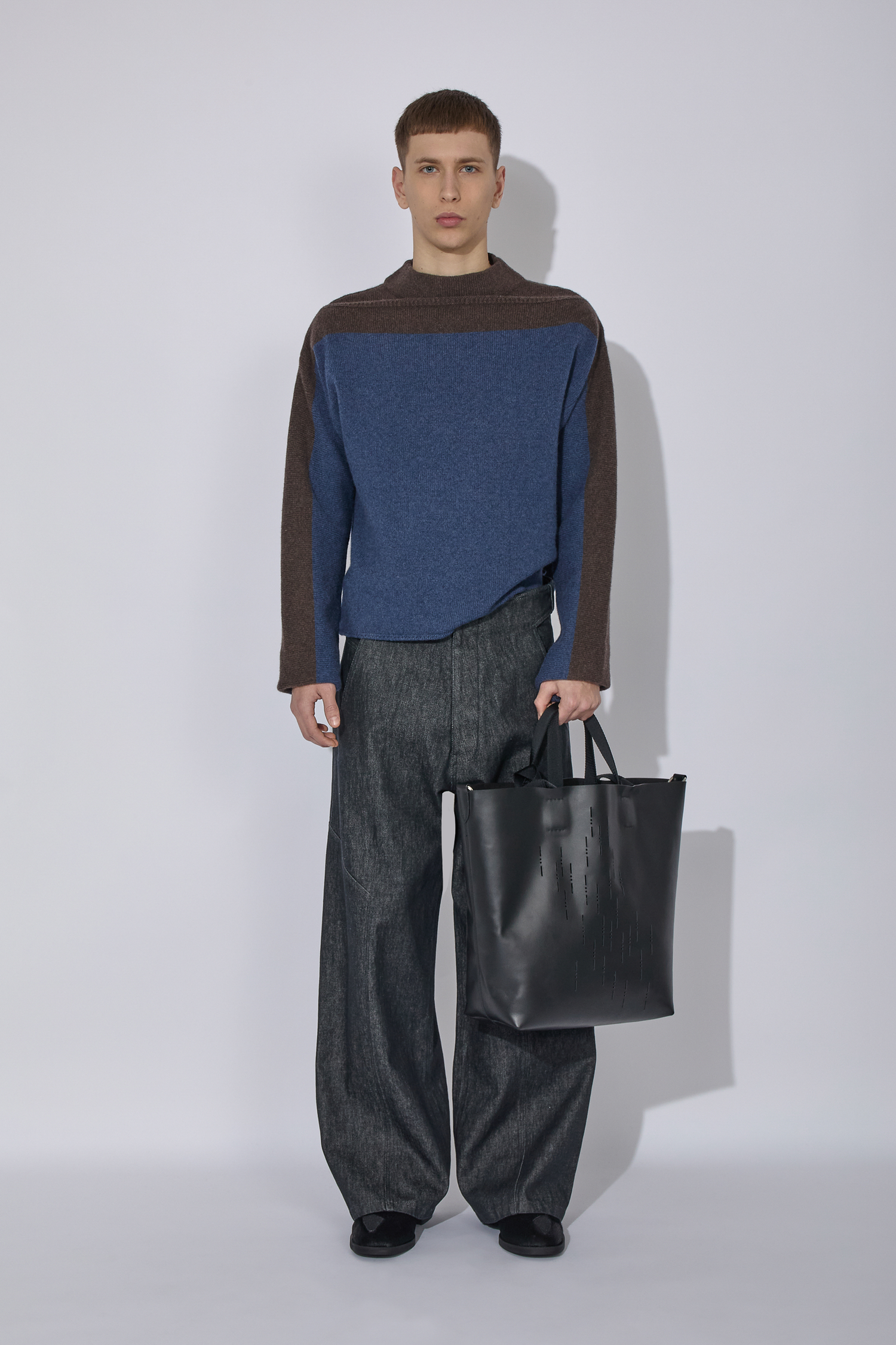The Terr Knit is crafted from soft-touch wool yarn and features a T-cut two-layer construction with horizontal dual-colour panelling. The precise knit technique and contrasting panels introduce visual complexity while maintaining comfort and warmth.