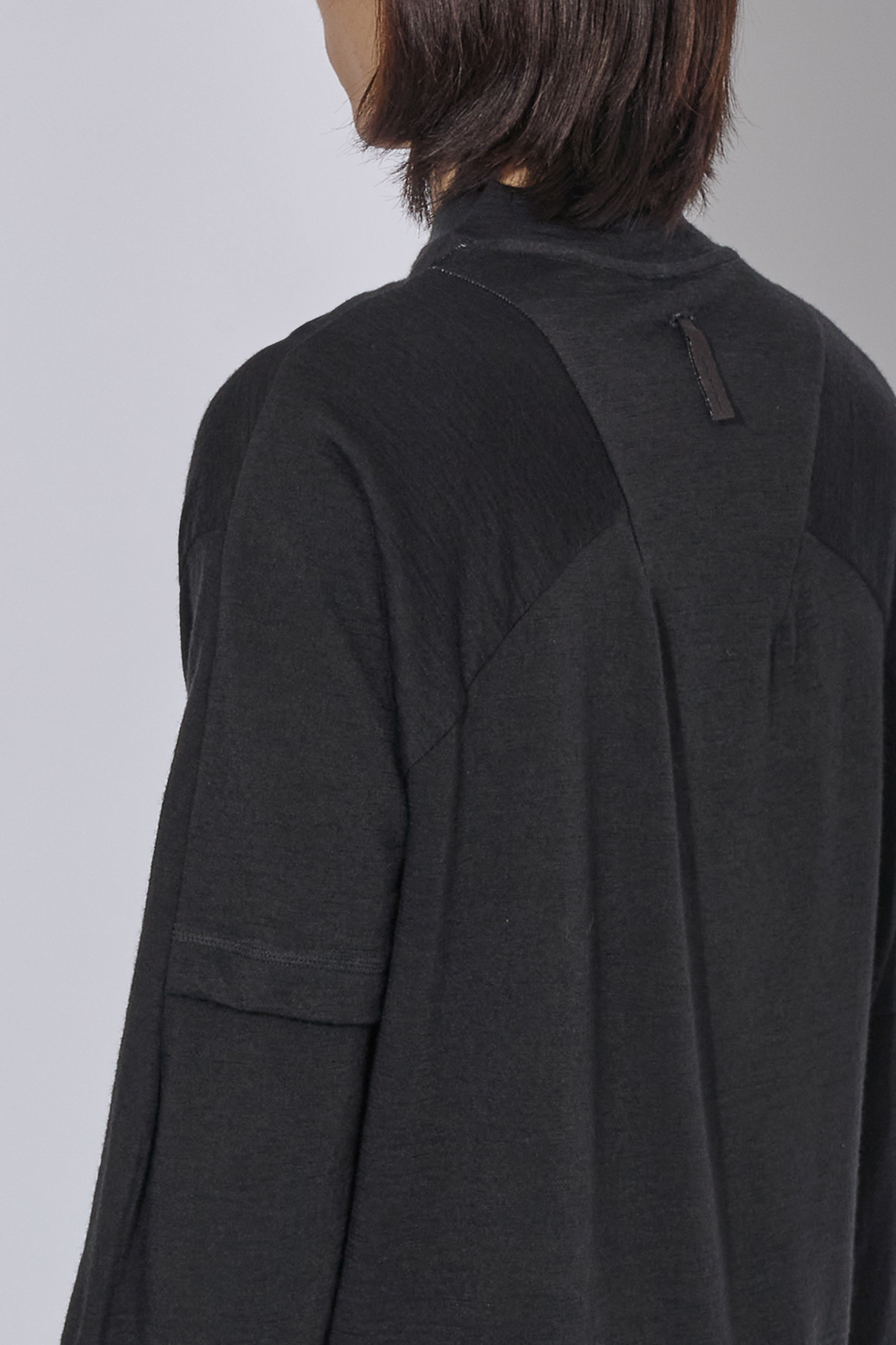 The Sylvie Tee is designed with a two-layer construction, creating the illusion of wearing a short-sleeve shirt over a long-sleeve shirt when viewed from the back. Crafted from a lightweight wool-nylon blend, this design introduces a layered aesthetic that enhances the versatility of the garment.
