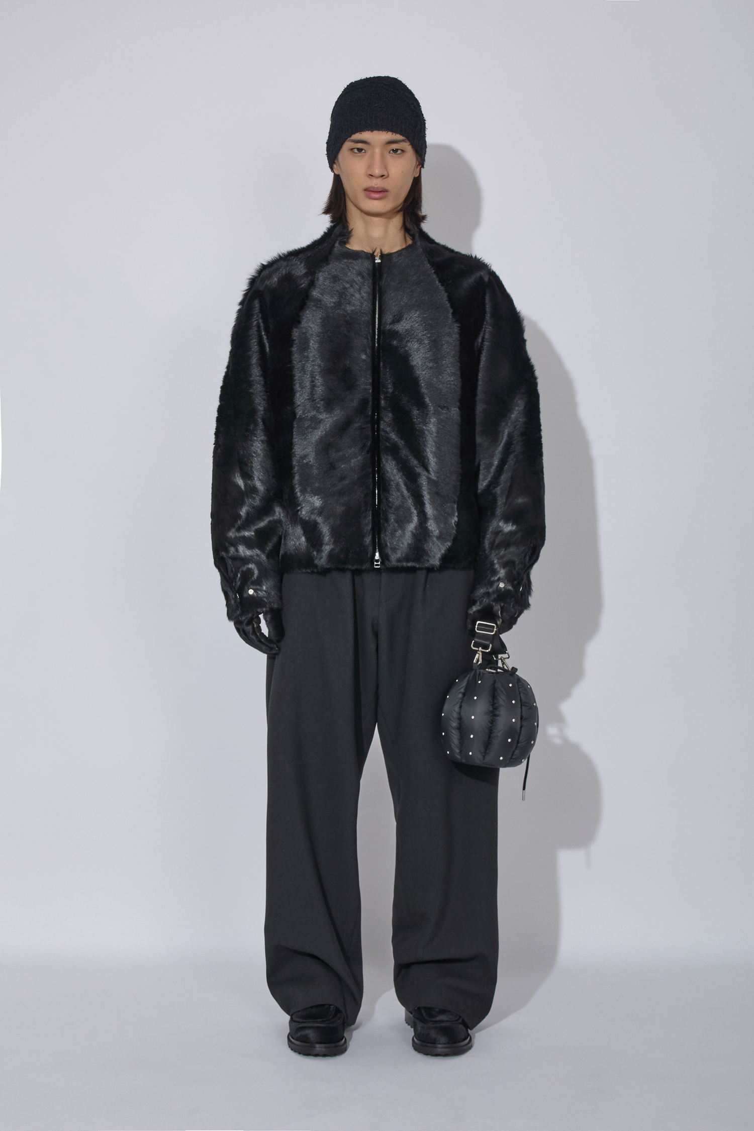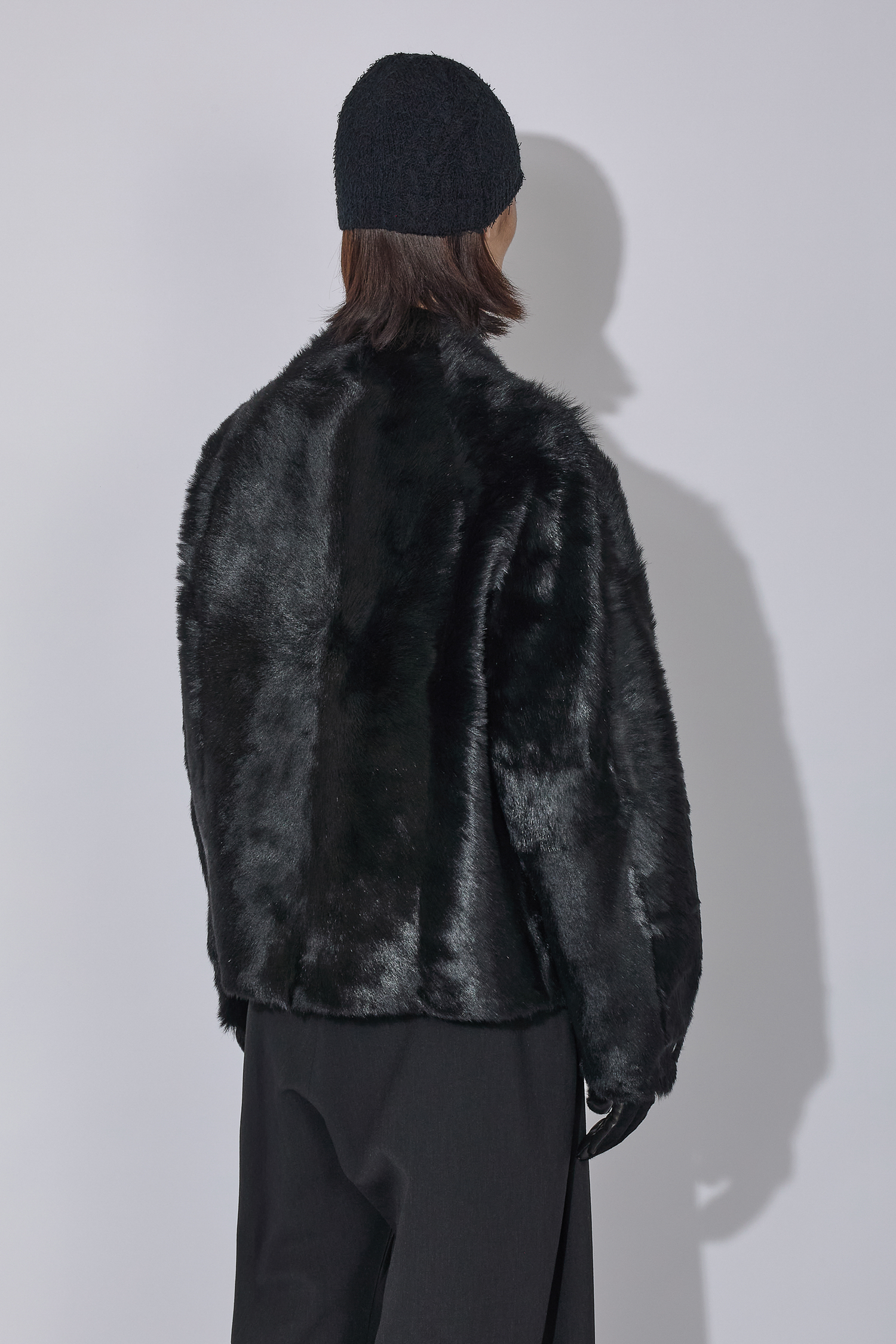 Crafted from long-hair calf leather, the Drosk Jacket features clean, round seam lines that flow seamlessly across the garment. A stand collar, shaped by vertical darts, refines the silhouette. Precision detailing is highlighted through a four-pocket setup and snap closures at the cuff.