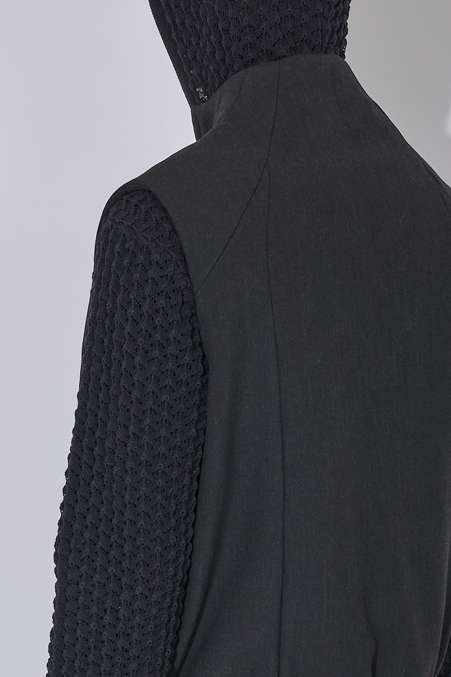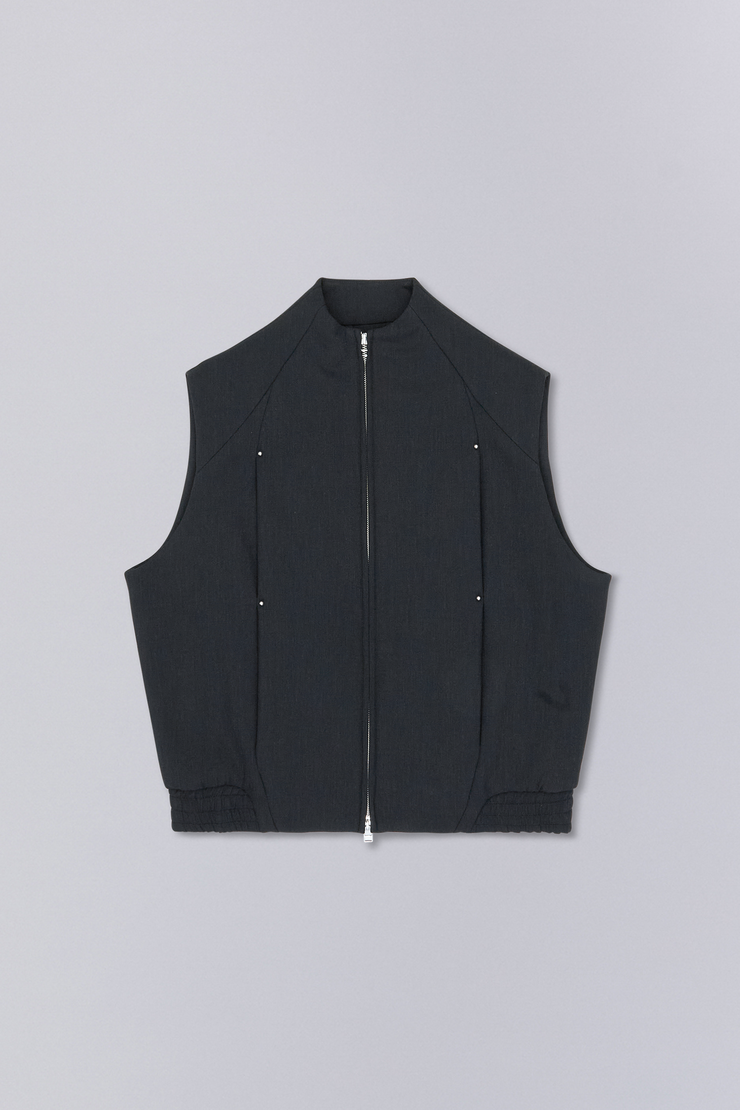 Crafted from soft structured double-woven melange fabric with a wadded fi ll, the Uvas Gilet incorporates a stand collar, shaped by vertical darts and seam lines to create structure. Four front pockets, detailed with twin stud fastenings, add functional depth, while an elasticated waistband at the hem provides a refined and adjustable fi t.
